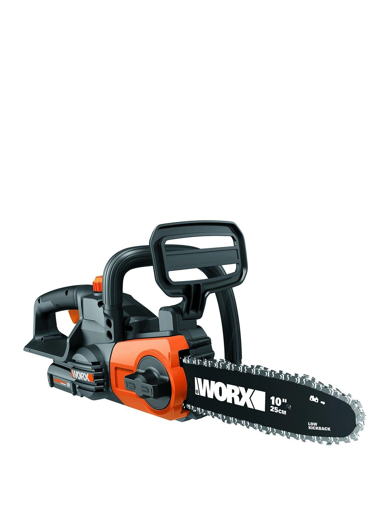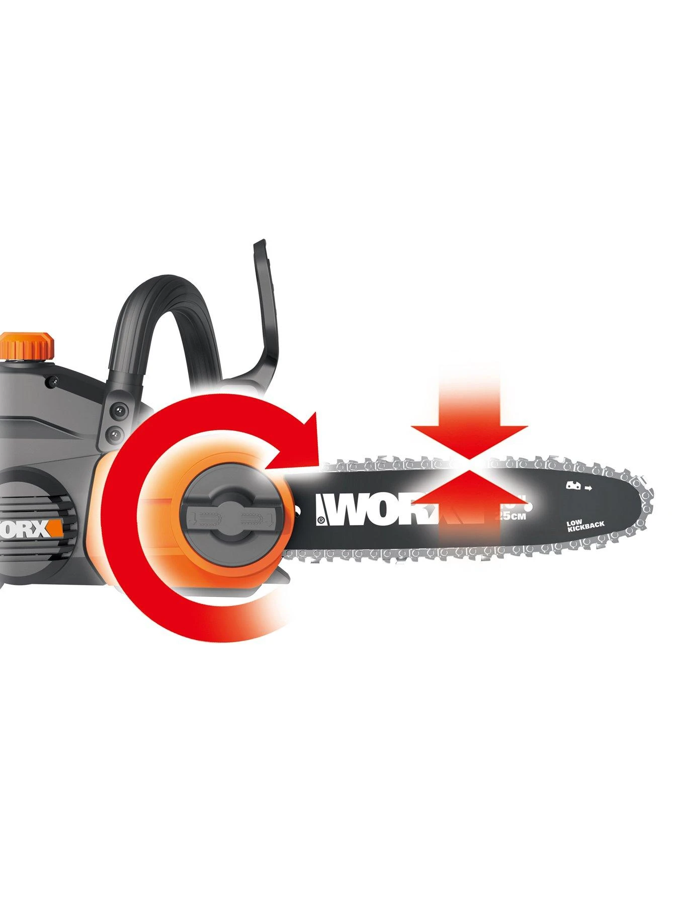 The Worx WG322E 25cm cordless 20V chainsaw has plenty of power to provide clean, fast cuts for quick clean-ups or pruning tasks. Its also packed with features like our patented tool-free auto chain tension system that keeps optimal chain tension while cutting and automatic chain lubrication for hassle-free operation.