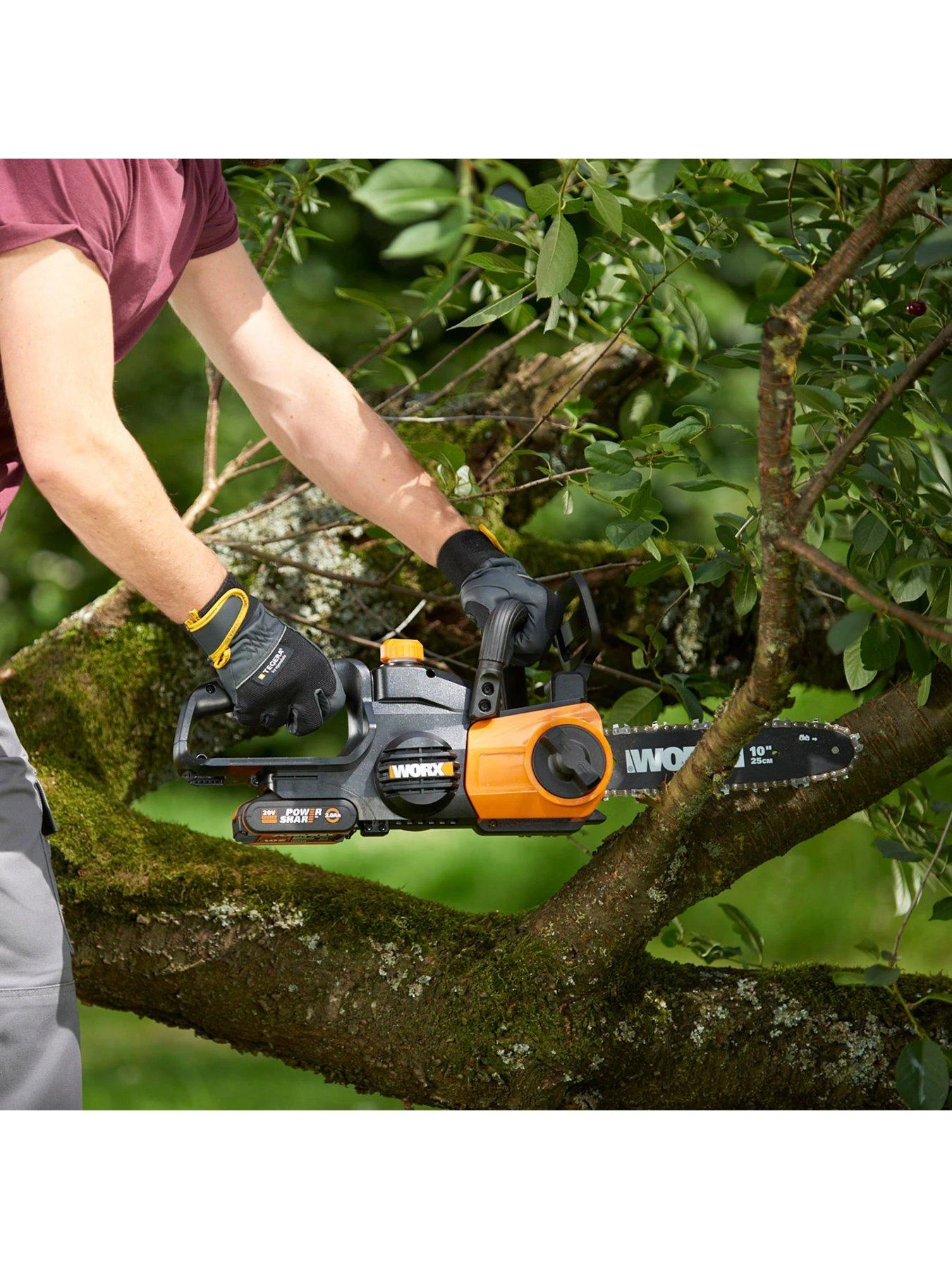 Get straight down to work with the Worx WG322E 20V Cordless Compact Chainsaw.